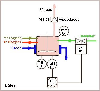 Tételezzünk fel az 5.ábra szerinti köpenyhűtéssel ellátott reatort, amelyben erős hőtermeléssel járó reakció zajlik. A kockázatelemzés megállapította, hogy a köpenyhűtés kimaradása "hőmegfutást" okoz, amely a készülék felrobbanását eredményezheti.