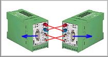 Erre láthatunk példát a jobboldali képen. A modulnak 2 pár opto csatlakozója van, egyik a bejövő (adás-vétel), másik a kimenő. A leágazó oldal sima RS485 csatlakozó, közvetlenül a PLC-re (vagy ahová kell) köthető.Az eszköz hibafigyeléssel is el lehet látva. Ha valamely oldalán kommunikáció- vesztést észlel, kétállapotú kimenetén jelezheti. Hasznos, ha a hibakeresést diagnosztikai LED-ek könnyítik.